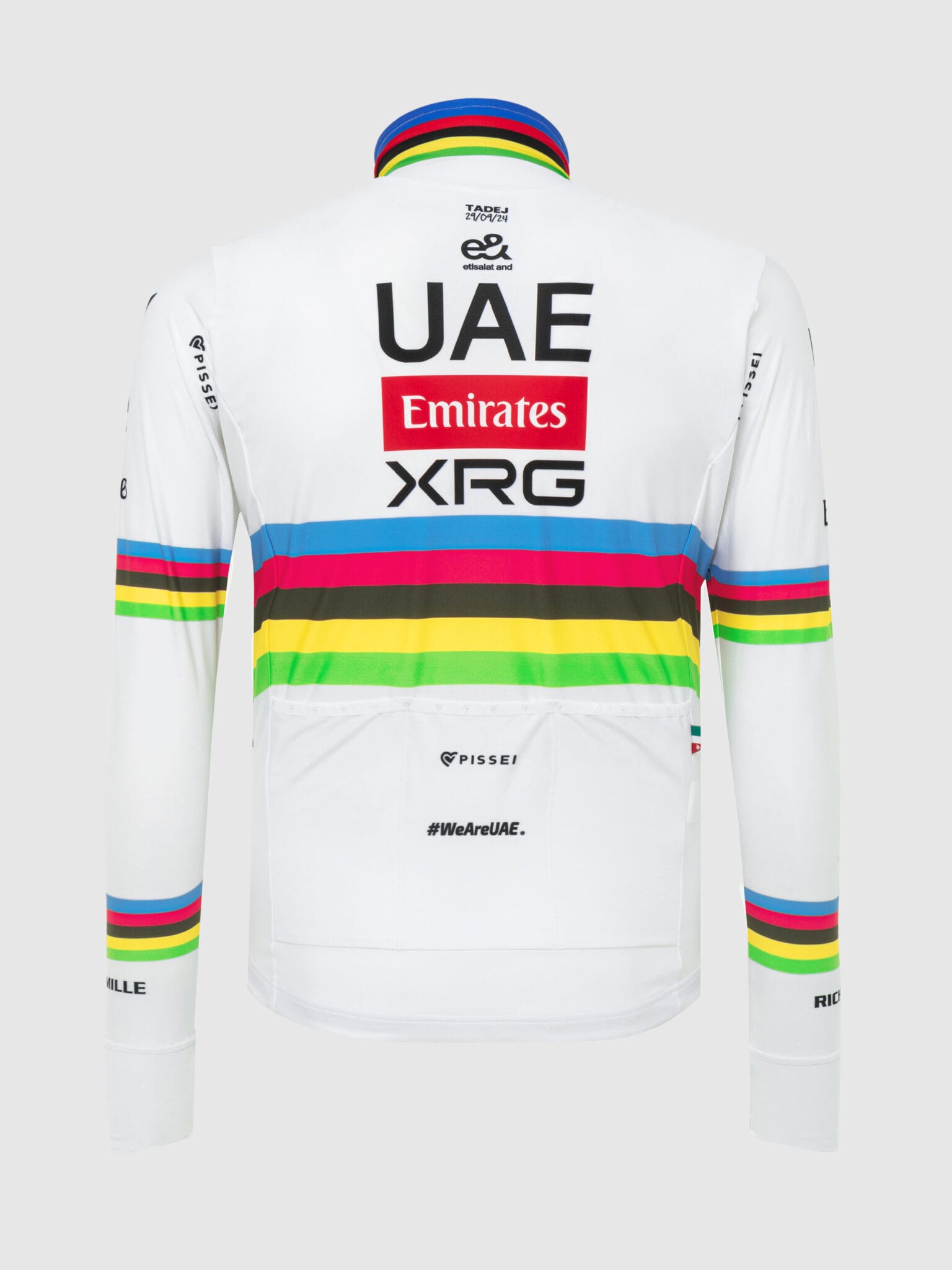 La maglia da ciclismo Pissei Jersey Team UAE 2025 World Champion è una maglia da ciclismo di Tadej Pogačar, che celebra il campione del mondo. La maglia è realizzata in tre diversi materiali (parte anteriore, maniche, retro) che garantiscono comfort, aerodinamicità e traspirabilità. Questa costruzione garantisce una vestibilità perfetta per tutte le corporature, le maniche sono realizzate in tessuto aerodinamico, che contrasta con la parte posteriore in rete, consentendo la massima traspirabilità. Il bordo inferiore è dotato di uno speciale rivestimento in silicone, che aiuta la maglia a rimanere in posizione. Ha tre comode tasche sul retro. La maglia è molto bella e comoda da indossare.